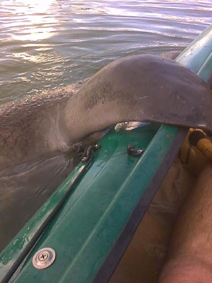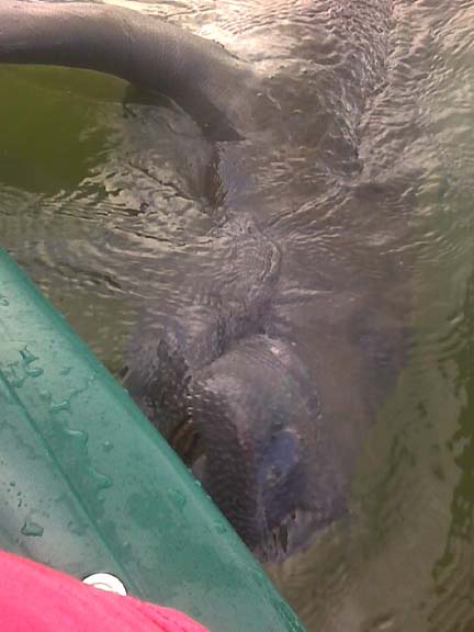 Here he latches on the kayak for some reason. As much as we enjoyed seeing him, we were afraid he would tip the boat over as he weighed about 2000 pounds. Remember it is against Florida state law to touch or pet manatees.