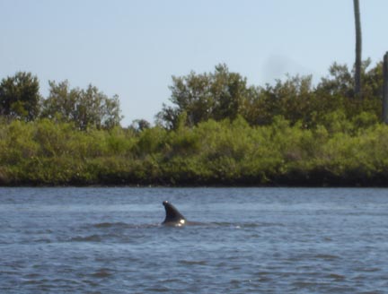 A large bull dolphin is fishing in the bay. Most of the time the bull dolphins are solitary and this one is chasing mullet in the shallows at Tarpon Bay in the Ding Darling NWR on Sanibel Island in Florida.